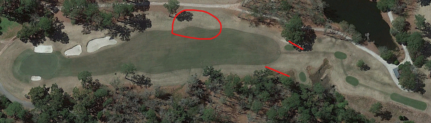 Visual clutter and uncertainty continue on the sixth hole, a mid-length par-4. As you can see from the overhead, the gap between the trees lure the players eyes over to the right of the fairway, where I have drawn the red circle. Further, this hole is so flat, that I asked for a yardages to the first greenside bunker and pulled my 3-wood instinctively. It looks easily reachable, despite being 350+ yards away. These are two competing thoughts: (1) the hole is pointing me to the right of the fairway but (2) the bunker, now left of target, appears reachable. In the 90 or so seconds that you have to make a decision, commit to it, walk to the tee, and swing, this is a lot of visual information to process. This lead everyone in our group to either send it into the right rough or take too little club off the tee; exactly Coore & Crenshaw’s intent, I’m sure.