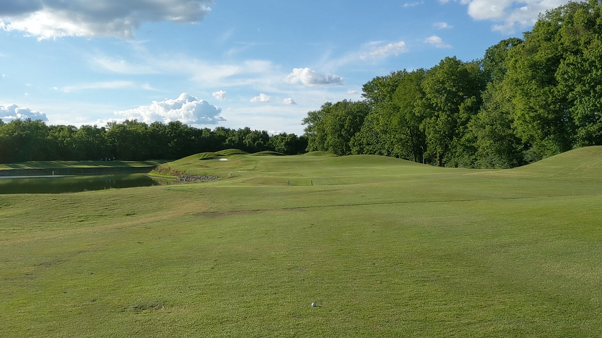 The eighteenth is also quite a tough hole, being a longer par-4 that is bordered by the pond on the right, and a mound littered with three circular bunkers on the left. The hole is as challenging as it is aesthetic, as the approach shot works to a slightly elevated green, now protected by a singular greenside bunker.