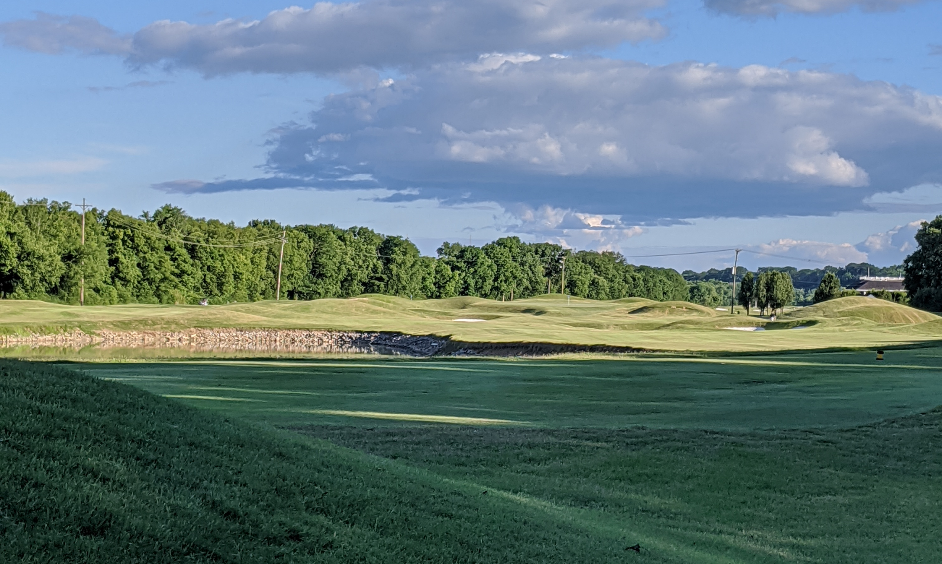The fifteenth is a bit of a menace. The mid-length par-4 is not long, but works parallel to an internal lake on the right, shared between the fifteenth and eighteenth holes. The landing area is tight, and a pulled drive will bounce down the mounds seen to the left on the picture of the fourteenth hole. The green sits at an uncomfortable angle to the fairway, as the hole utilizes a late dogleg around to a semi-peninsula of the lake. This hole can produce a birdie chance, but a wayward drive will often end in a big number.