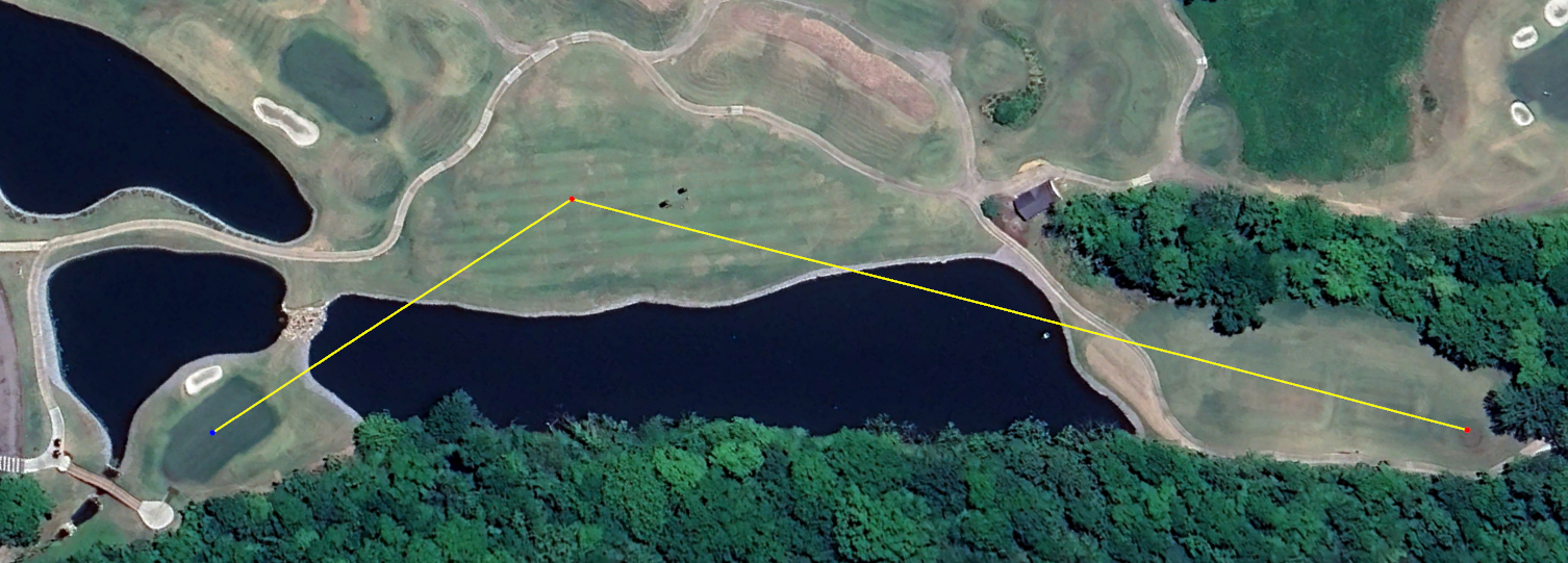 The eleventh is a longer par-4 that looks relatively benign from the tee. A player cannot see the protruding pond from any of the tee boxes, and the corner of the pond is reachable from any tee box except the furthest back. However, it is only reachable at the very end of a long drive. This creates a tough choice: laying back to take the pond out of play with a three wood makes for a very long second shot, yet going with driver comes with the risk of the last bounce of a pulled drive being into the water. The area between the tee line and the lake on the left is a relatively narrow 36-yards wide, but the player laying back with less than driver has infinite bail out room to the left.