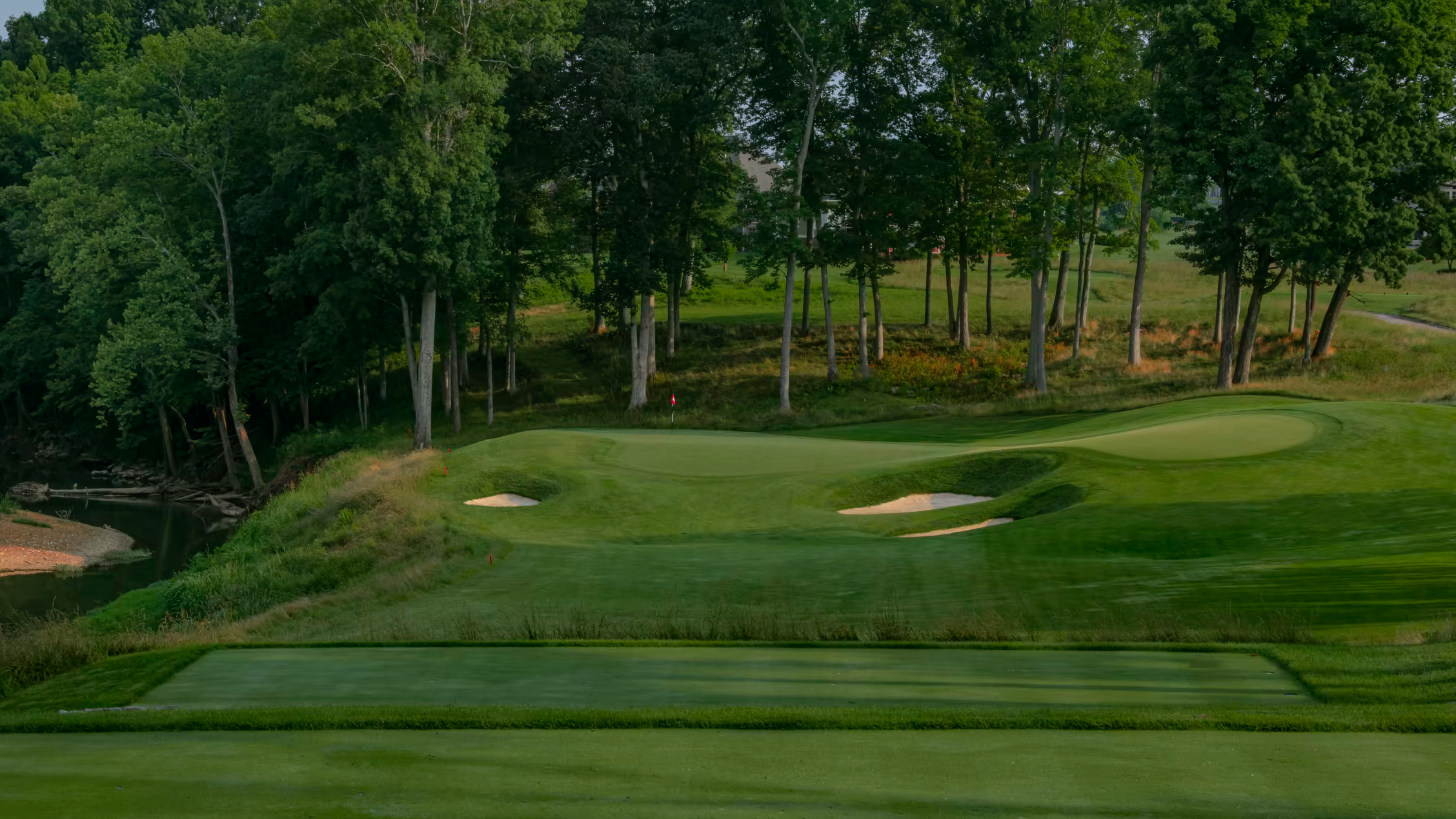 The design pressure is obvious: the hole is guarded by water and a tiered green that’s effectively saying, sure, hit the green—now pick the correct layer of the green. Between the water, the tiers, and the way the putting surface is protected, the target plays smaller than you want it to. You can’t just “find the green” and relax. You have to hit the right part of it, or you’re immediately putting from a different zip code.