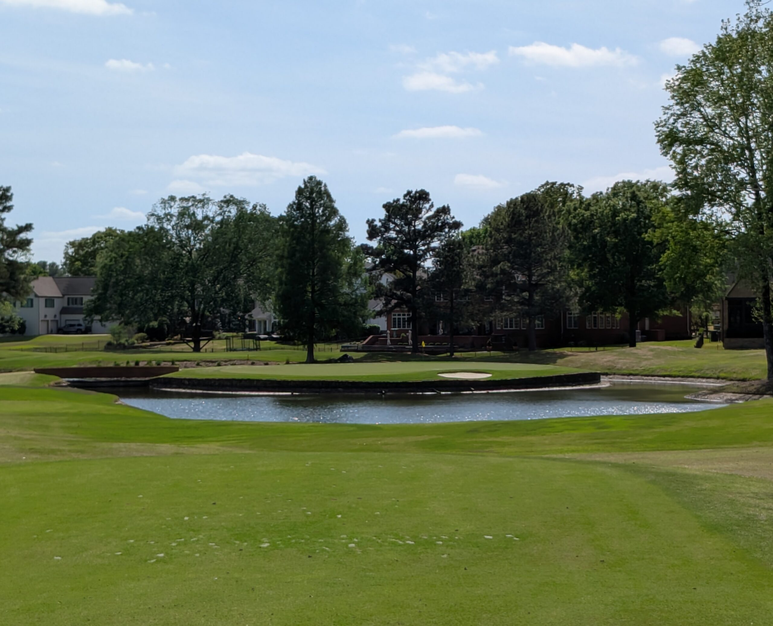 Lastly, and perhaps again arguably the signature hole at TPC Southwind, the par-4 eighteenth; a near 90-degree dogleg protected by a lake on the inside of the dogleg, and three cascading bunkers on the outside. The trouble is not over after the tee shot, as the lake extends up to the green and the approach shot can be a long one, bringing that danger back into play on the second shot.