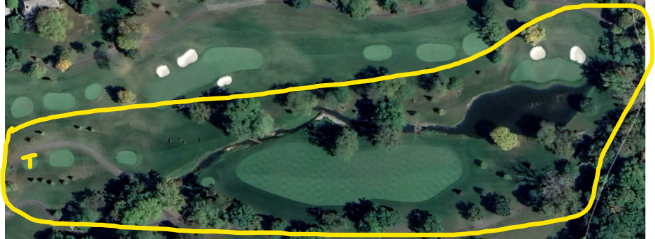 With the current firmness of the greens, the second shot is very difficult, as the green is narrow to the approach angle, with water short and bunkers long. This is likely the toughest hole on the front side because it requires two perfect shots to score, and once off the beaten path, the recovery shots may be even tougher, as the fairway to the right of the lake is very narrow.